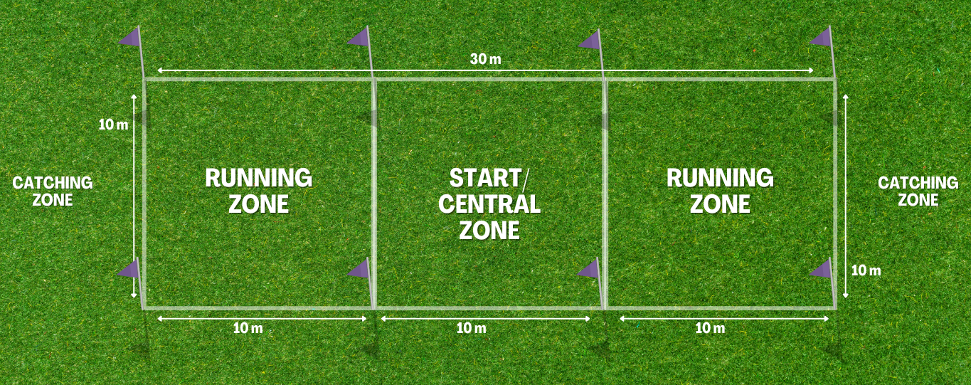 🟣 Puller rzucony ze strefy startowej musi przekroczyć linię oddzielającą strefę rozbiegu od strefy łapania pomiędzy chorągiewkami/stożkami wskazującymi narożniki kwadratu strefy rozbiegu.